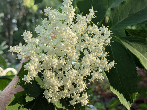 [Image description: a disc of white flowers sits atop a stem of elderberry, Sambucus canadensis]