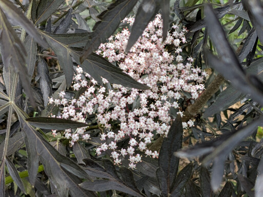 [Image description: the white and pink flowers of a black lace elderberry peek out from underneath the dark purple leaves]