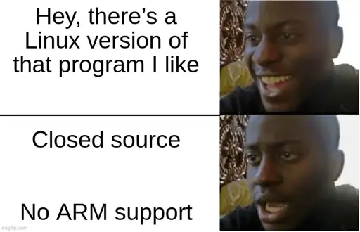 [Guy looking happy:] Hey, there’s a Linux version of that program I like