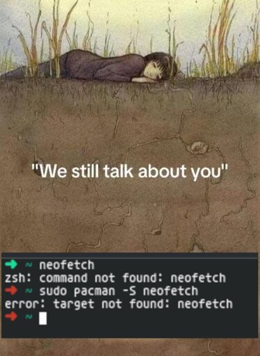 neofetch???Got archived because it’s “feature complete” and won’t receive more updates, but some package managers removed it.