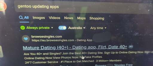 DuckDuckGo doesn’t track your activity so they only target ads based on your current query and technical details. They determined it would take 30 years to compile Gentoo on your rig so 40+ is a good guess for your age.