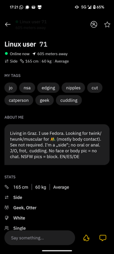 Toldry@lemmy.world to linuxmemes@lemmy.world · 2 months agoEncountered a linux user in Grindrlemmy.worldimagemessage-square62linkfedilinkarrow-up1262arrow-down118