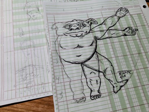I wanna know more about what you were thinking of when you were drawing the face. It reminds me of how Japanese artists draw Orcs as pig-like, or like the early drawings for Warcraft or D&D when there wasn’t really a set cultural depiction for fantasy goblins yet.