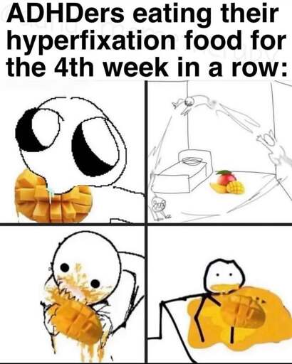A month or so ago all I wanted to eat was mangoes, then the adhd goblin told me that mangoes are too hard and I moved on to microwave hamburgers.