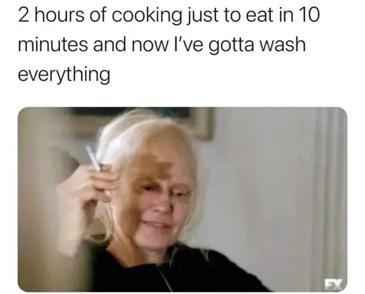 Every time this is posted I am going to point out that if you take 2 hours for cooking every time, you are doing something wrong. 1 hour is maybe more realistic but for a lot of meals I make I don’t need more than 30-40 minutes.