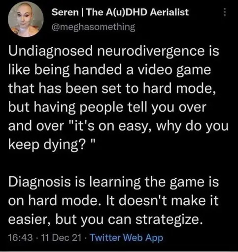 minus-squarexkforce@lemmy.worldlinkfedilinkEnglisharrow-up0·edit-22 years agoCBT therapy is the tutorial. The drugs are aim assist. The game is still set to hard but at least now you have a fighting chance