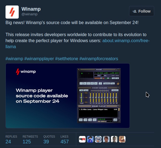 Press Release- Inside information May 16, 2024 – 08:30 CEST Winamp has announced that it is opening up its source code to enable collaborative development of its legendary player for Windows. Winamp has announced that on 24 September 2024, the application’s source code will be open to developers worldwide. Winamp will open up its code for the player used on Windows, enabling the entire community to participate in its development. This is an invitation to global collaboration, where developers worldwide can contribute their expertise, ideas, and passion to help this iconic software evolve. Winamp has become much more than just a music player. It embodies a unique digital culture, aesthetic, and user experience. With this initiative to open the source code, Winamp is taking the next step in its history, allowing its users to contribute directly to improving the product. “This is a decision that will delight millions of users around the world. Our focus will be on new mobile players and other platforms. We will be releasing a new mobile player at the beginning of July. Still, we don’t want to forget the tens of millions of users who use the software on Windows and will benefit from thousands of developers’ experience and creativity. Winamp will remain the owner of the software and will decide on the innovations made in the official version,” explains Alexandre Saboundjian, CEO of Winamp. Interested developers can now make themselves known at the following address: about.winamp.com/free-llama