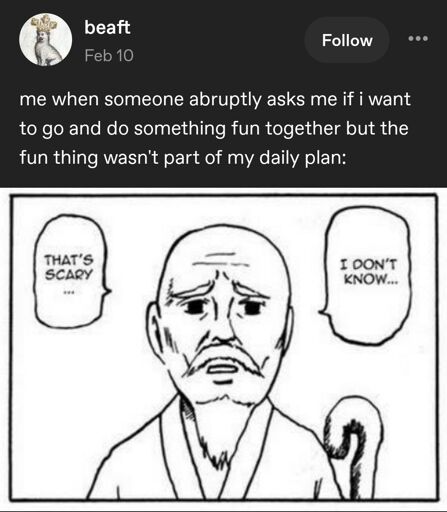 minus-squareapprehensively_human@lemmy.calinkfedilinkEnglisharrow-up12·12 days agoThis seems more like an introvert thing. If I’ve already exhausted my social battery for the day, ain’t no way I’m agreeing to interact with more people later.
