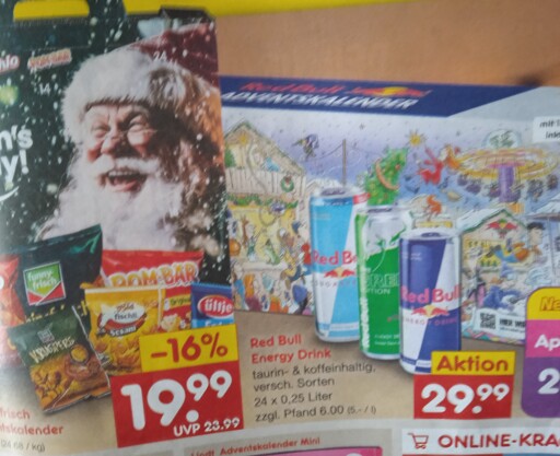 Aber kommen wir zum nächsten Adventskalender. Hersteller ist Red Bull. Ist nicht Euer Ernst nach Gummibärchen-Brause schmeckendes Gesöff mit echt nicht natürlichen Zutaten so adventlich an die Leute bringen zu wollen. Aber Red Bull verleiht ja bekanntlich Flüüügel, die auch Fridolin, der Weihnachtsengel besitzt. Von daher passt’s oder auch nicht. 😇