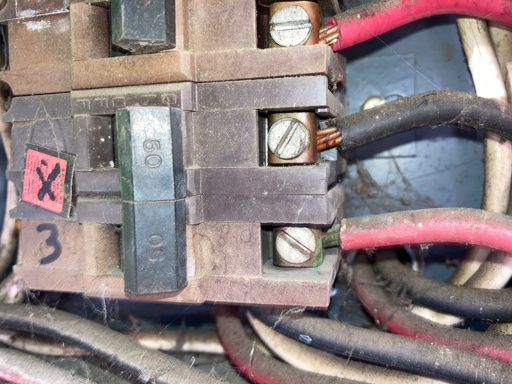 Visual inspection of the breaker box outside shows one of the wires looks a bit corroded. Wires to/from the rest of the units are a nice copper color. Is that a red flag?