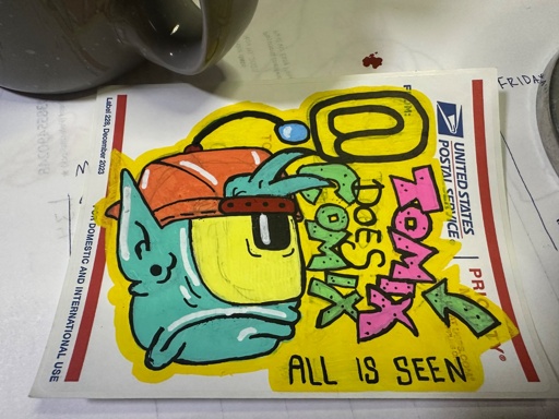 Stickers drawn on those postal labels are called slaps. I couldn’t think of a title and panicked!
