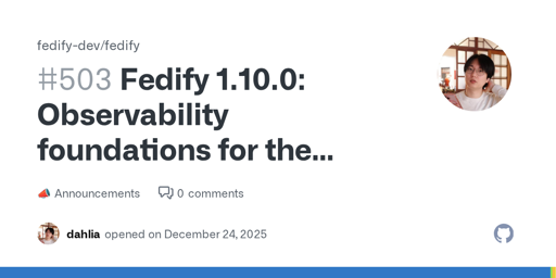 洪 民憙 (Hong Minhee)@lemmy.ml to ActivityPub@lemmy.mlEnglish · 4 months agoFedify 1.10.0: Observability foundations for the future debug dashboardgithub.comexternal-linkmessage-square0linkfedilinkarrow-up14arrow-down10cross-posted to: fediverse@lemmy.mlfediverse@lemmy.world