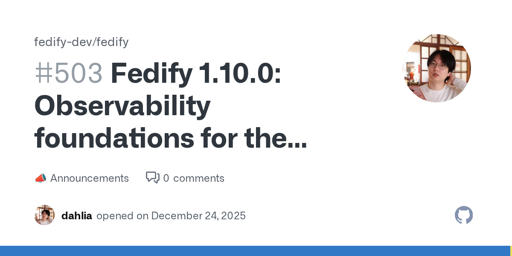 洪 民憙 (Hong Minhee)@lemmy.ml to Fediverse@lemmy.mlEnglish · 16 days agoFedify 1.10.0: Observability foundations for the future debug dashboardgithub.comexternal-linkmessage-square0linkfedilinkarrow-up18arrow-down10cross-posted to: fediverse@lemmy.worldactivitypub@lemmy.ml