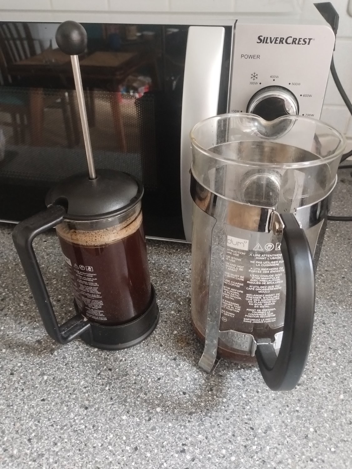 Ich besitze 2 schöne französische Pressen, mit denen ich mir meinen Kaffee mache. Ich trinke etwa 3-4 Tassen an etwa 4 Tagen die Woche, den Rest der Woche bin ich im Büro. Die große Press nutze ich nur wenn Gäste da sind, ansonsten mache ich mir über den Tag verteilt eine Tasse.
