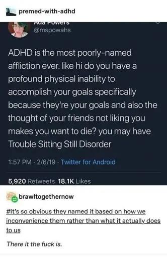 I think the OP has a stick-it-to-the-man sentiment. And I agree that there’s plenty of space for that in psychology. But I really don’t see that in the naming of ADHD. I would much rather sticking it to Freudian bullshit and the bases of the DSM.