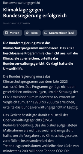 Ein wichtiges Urteil, damit der Klimaschutz nicht gänzlich unter die Räder gerät. Hier der Artikel der Tagesschau.