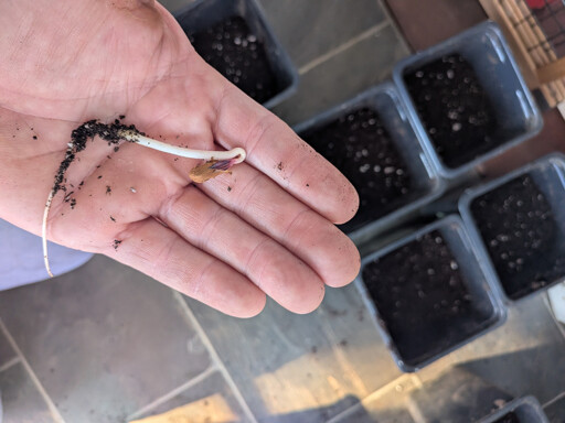 [Image Description: Seedling Bing cherries ready to be potted up for the growing season fit in the palm of my hand.]