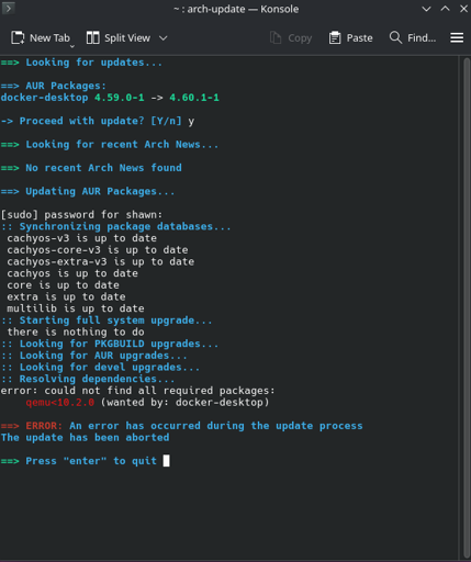 CachyOS has an updater and will not update docker because of Qemu