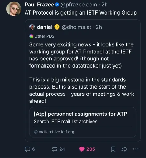 Atproto (protocol powering bluesky) will be further developed and standardized by the ieft (Internet engineering task Force), a group separate from the for-profit bluesky PBC