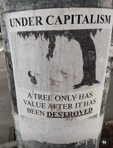 I would say trees growing in neat rows in an industrial monoculture orchard, or squeezed into a 3-ft strip of otherwise barren land next to a sidewalk slowly choking to death on concrete and pollution, have been destroyed in almost every way that matters. They physically still exist, yes, but trees are part of an ecosystem; capitalism kills the ecosystem and raises the tree as a zombie servant. It forces the tree to perform its profitable function, and nothing else, and destroys everything about it and everything around it that doesn’t serve that function.