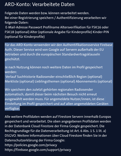 - https://accounts.ard.de/datenschutz - diese erwähnt Firebase Auth und ist erst seit Mitte 2024 zu finden https://web.archive.org/web/20240616161740/https://accounts.ard.de/datenschutz