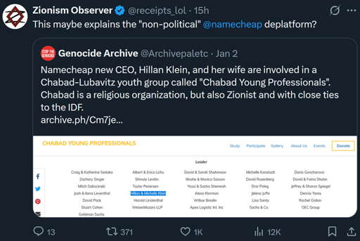 Technology@lemmy.zip•Domain registrar NameCheap bans Zionism Observer website two weeks promoting new Israeli linked CEO Hillan KleinEnglish